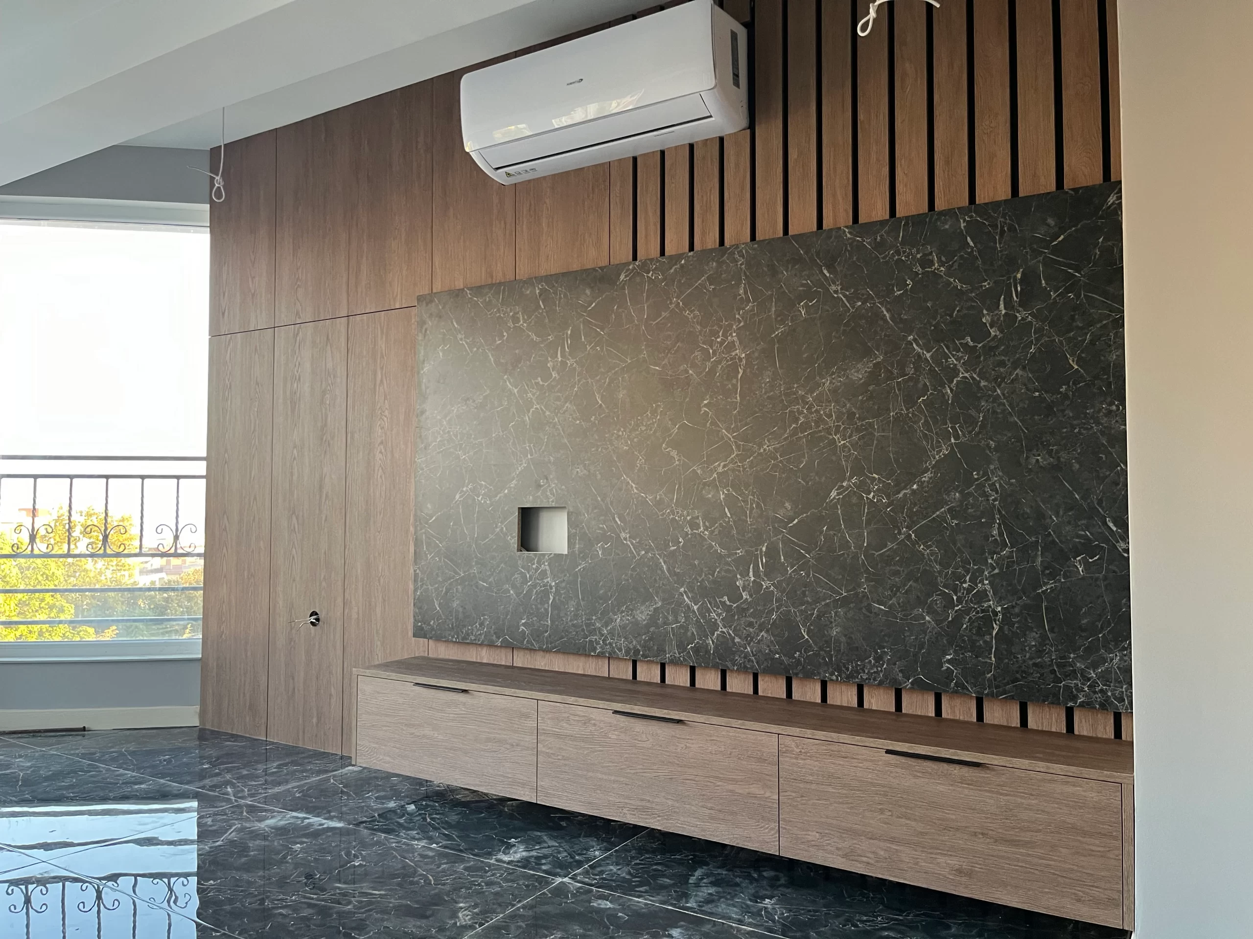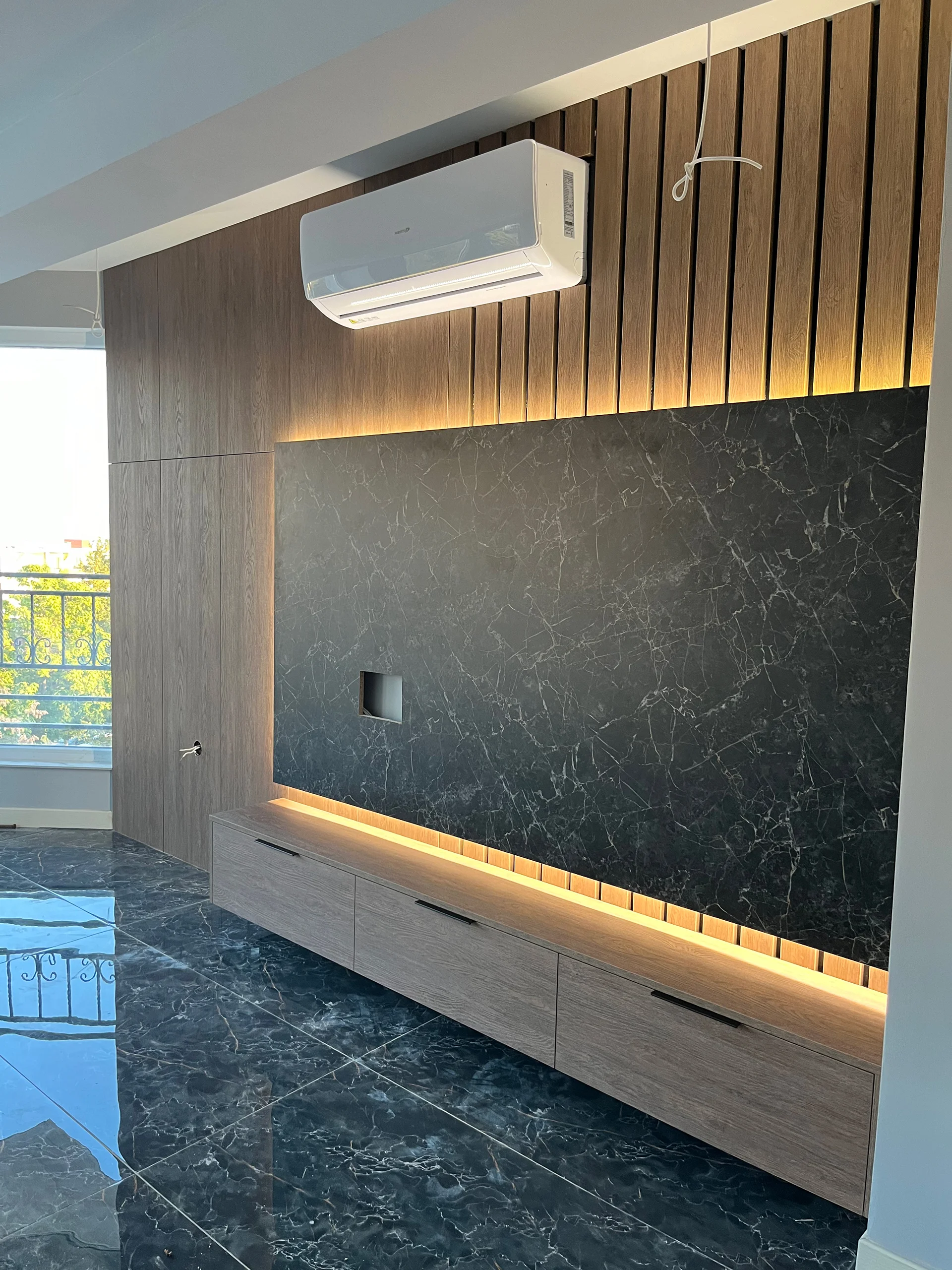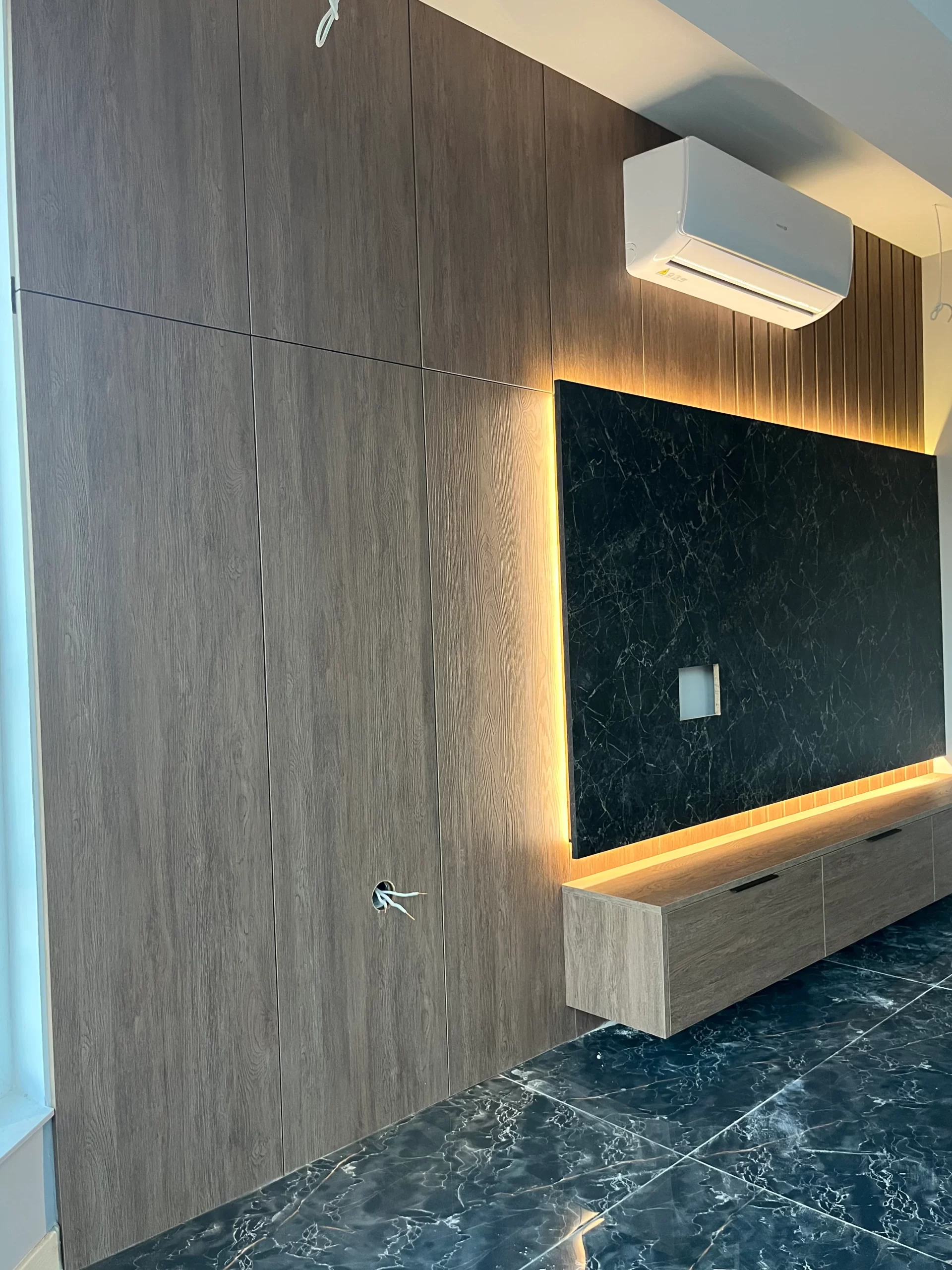 Стенен TV панел : ПДЧ Черен Мрамор 9252 с интегрирана LED подсветка